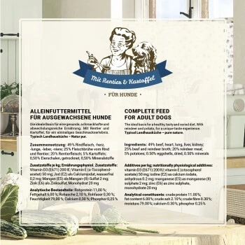 Wir empfehlen Rentier mit Rind und Kartoffel für alle ausgewachsene normal aktive Hunde.
