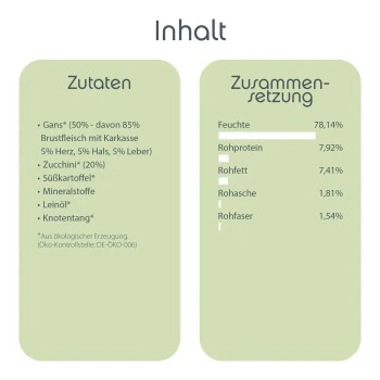 Bio-Gans als Hauptzutat ist die Grundlage unserer neuen Sorte. Eine einzige tierischen Proteinquelle im Futter ist uns ein besonderes Anliegen. Im Gegensatz zu vielen anderen Herstellern, verzichten wir außerdem vollständig auf Schlachtabfälle. Das Bio-Gänsefleisch ist mineralstoffhaltig und hat eine hochwertige Aminosäuren-Zusammensetzung, sodass Ihr Hund mit bestem Protein versorgt wird. Proteine sind wichtig für den Muskelaufbau und viele Körperfunktionen. Weitere Sorten von ChronoBalance Premium-Nassfutter finden Sie hier: Bio-Rind, Bio-Huhn und Schaf.