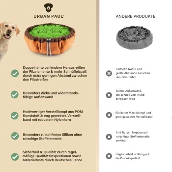 Fördere mit unserem hochwertigen URBAN PAUL Schnüffelteppich das Wohlergehen deines Vierbeiners. Je nach Größe deiner Fellnase kann der Schnüffelteppich individuell angepasst werden. Das optimale Intelligenzspielzeug für Zuhause.